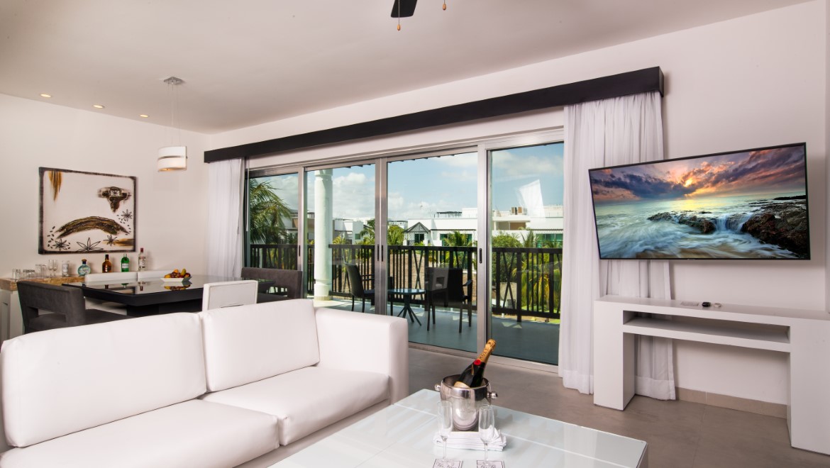 This Residence is decorated with art lamps, sculptures and large paintings on the walls. The bedroom has a king size bed with large wooden sliding doors that open up to a separate living room adorned modernly and equipped with a double pull out sofa bed. This suite also provides a full kitchen with granite countertops (refrigerator microwave, oven and stove), and a dining table. Guests can step right into the main pool and water deck in front of their suite’s patio.