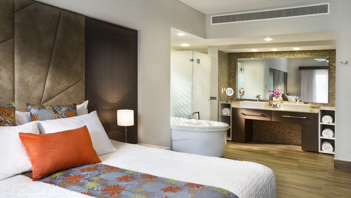 Penthouses have been created with the most discerning guests in mind, taking extravagance to a new level. Residences occupy the top floors of each building and features a private rooftop lounge. Enjoy the "al fresco” lifestyle with a full lounge area including a half bathroom, a patio with a table for 6, pergola, barbecue grill, a whirlpool tub for two (jetted pool without hot water) or hot tub Jacuzzi® based on availability, chaise lounges and a relaxing Bali bed.